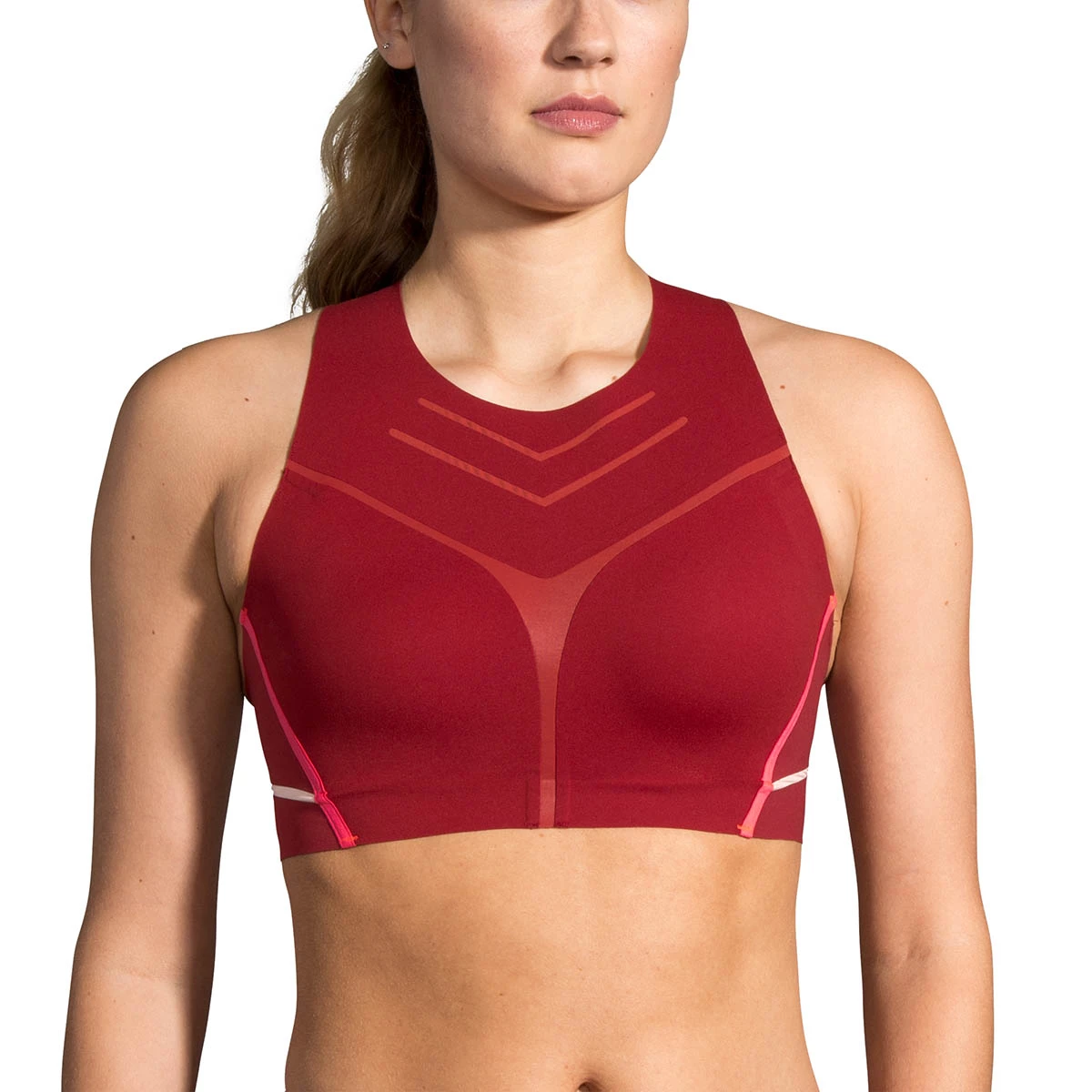 - This bra’s high neckline and longer length delivers a modern, streamlined look that layers easily and looks great solo, too.