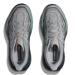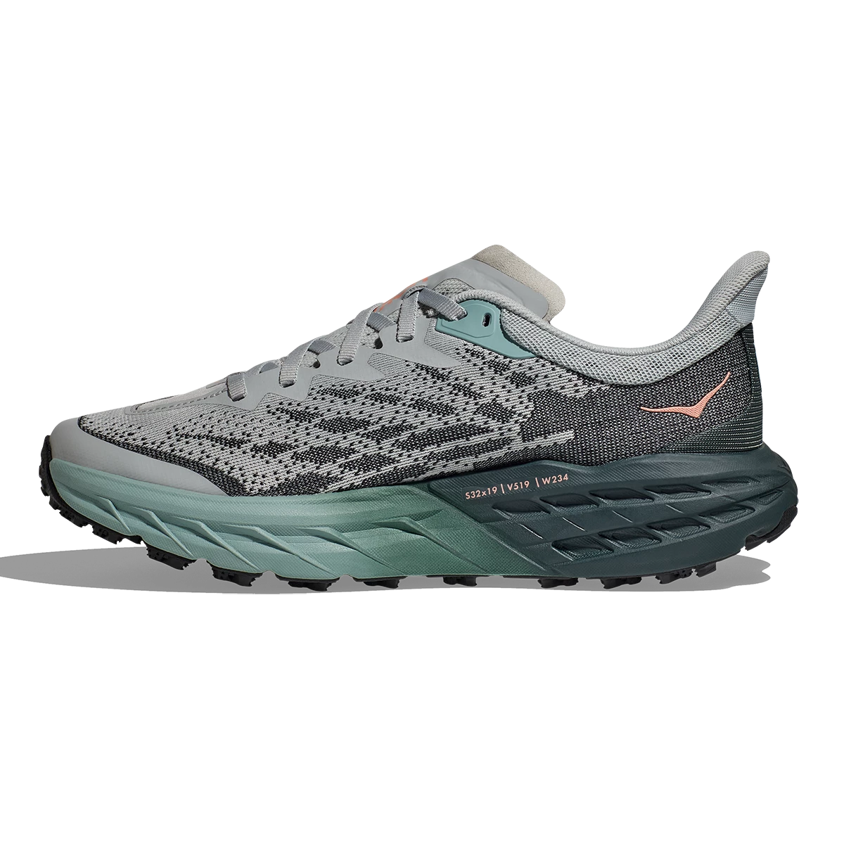 The HOKA Speedgoat 5 is a highly cushioned technical trail running shoe designed to attack a wide variety of terrain.